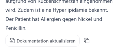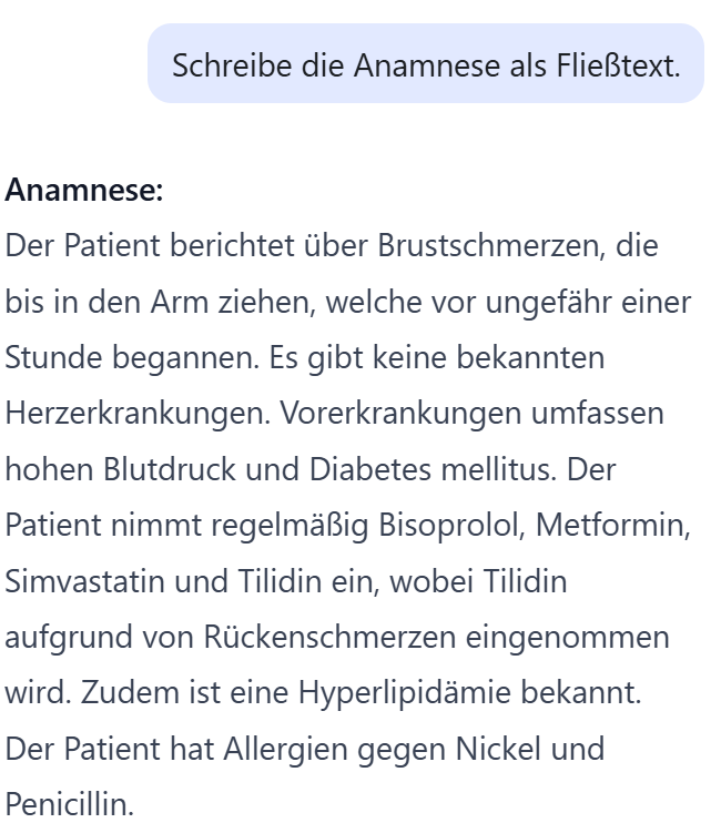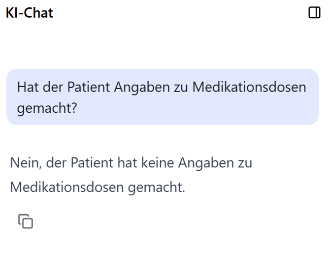 Bitte beachten Sie, dass der KI Chat faktische Fragen zum geführten Gespräch beantwortet. Er sollte nicht zur medizinischen Entscheidungsfindung herangezogen werden. Nutzen Sie den Assistenten bewusst. Sie übernehmen die Verantwortung für die Nutzung dieses Features.