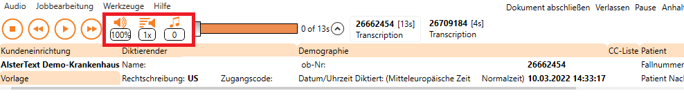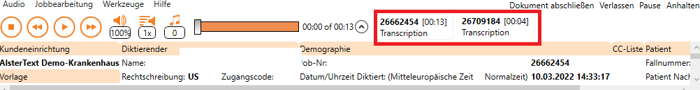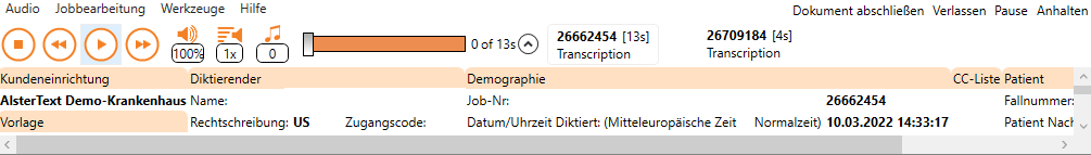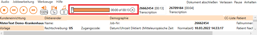 Rechts im Audio-Player sind die für Sie geladenen Diktate und deren Länge zu sehen. |