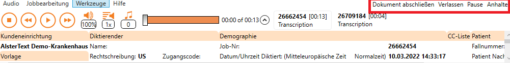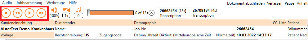 Nachdem Sie ein Diktat geöffnet haben, startet der Audio-Player automatisch. Über die rot markierten Buttons ist es möglich das Diktat auch manuell mit der Maus zu |
