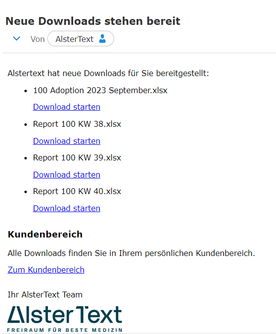 Im Kundenbereich von AlsterText stehen Ihnen Anleitungen und verschiedene Reports zum Download zur Verfügung. Hier lesen Sie, wie sie zu neuen Downloads benachrichtigt werden und wie Sie diese herunterladen können.