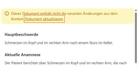Mit Auswahl eines Dokuments wird Ihnen ein Hinweis angezeigt, dass das Dokument nicht neuesten Änderungen aus dem Kontext enthält. Mit Klick auf Dokument aktualisieren, können Sie die Informationen direkt übernehmen und das Dokument updaten.