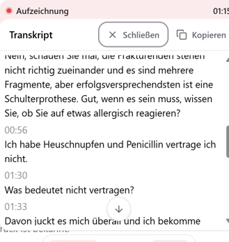 Das Transkript ist auch nach einem Gespräch verfügbar. Sie können es jederzeit aufrufen und bei Bedarf über Kopieren in ein anderes System oder Dokument einfügen.
