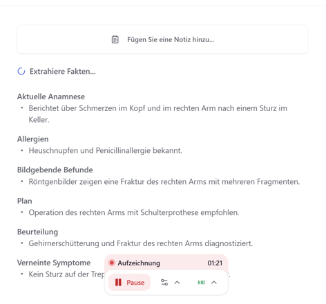 Klicken Sie anschließend auf Aufzeichnen und beginnen wie gewohnt das Gespräch mit Ihrem Patienten. Während des Gesprächs werden in Echtzeit Fakten aus dem Gespräch gezogen. Diese werden im Hintergrund extrahiert und nach und nach auf der Oberfläche für Sie sichtbar.