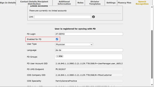 Klicken Sie anschließend auf die Registerkarte Speech Recognition. Über den blauen Haken Enabled for FD steuern Sie die Aktivierung und Deaktivierung. Ist der blaue Haken gesetzt, ist die der Account aktiv. Der User kann sich in Fluency Direct einloggen und die Spracherkennung nutzen. Der blaue Haken gilt AlsterText als Indikator dafür, dass die Lizenz abrechnungsfähig ist.