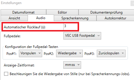 Bei Automatischer Rücklauf wird die Sekundenzahl eingetragen, um wie viel das Diktat |