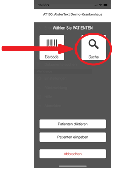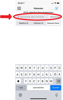Klicken Sie nun in diese Zeile am oberen Bildschirm- rand und geben Sie über Ihre Handytastatur den Namen oder die Fall- bzw. Patientennummer ein. |