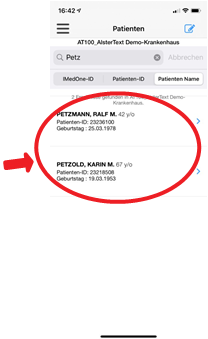 Falls mehrere Patienten auf Ihre Suchkriterien passen, wählen Sie den richtigen Patienten. Die Daten werden dann automatisch übernommen. |