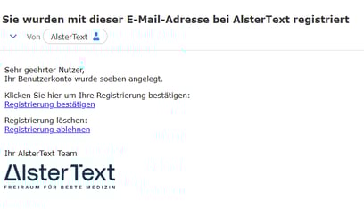 1. Sie erhalten von AlsterText eine E_Mail mit der Aufforderung, Ihre Registrierung zu bestätigen. Klicken Sie auf Registrierung bestätigen, um den Vorgang zu beginnen. Selbstverständlich können Sie einer Registrierung auch widersprechen. Klicken Sie dazu auf Registrierung ablehnen.