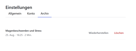 Um eine Übersicht der archivierten Sessions zu erhalten, klicken Sie in der Navigationsleiste auf Einstellungen. Wählen Sie anschließend Archiv. Dort werden Ihnen alle archivierten Sessions angezeigt.